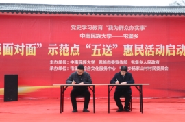 为深入学习宣传党的十九届六中全会精神,贯彻落实省委宣传部关于在“理论热点面对面”示范点开展“”五送“惠民活动的工作要求,12月9日-10日,15vip太阳集团官网组织由马克思主义学院牵头、由公共管理学院、音乐舞蹈学院、法学院、计算机科学学院共同参与的师生工作队28人,赴恩施屯堡乡开展“五送”活动,把党的创新理论、法律知识、现代信息技术、中华优秀文化、致富信息、干部培训送到民族地区乡村基层群众家门口。